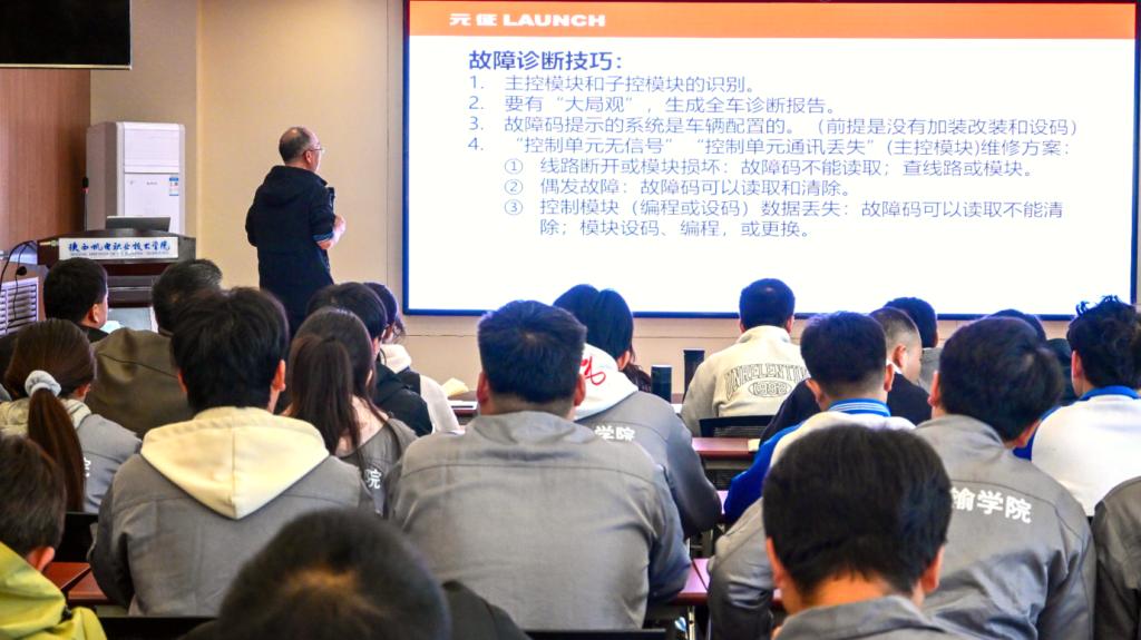 本次培训钟克有以汽车产业技术升级趋势为切入点,紧扣产业实际痛点与人才需求导向,围绕新能源汽车核心诊断技术、燃油车维修工艺优化、行业岗位技能标准三大核心模块展开深度分享。培训过程中,采用“实战案例拆解 + 设备实操 + 行业趋势解读” 的三维教学法,将 X-431 诊断设备的实操应用、新能源汽车常见故障排查逻辑、维修安全规范等关键技能倾囊相授。他强调,职业教育需紧扣产业脉搏,鼓励学生以“理论+实践”双轮驱动,锤炼适配行业发展的硬本领。