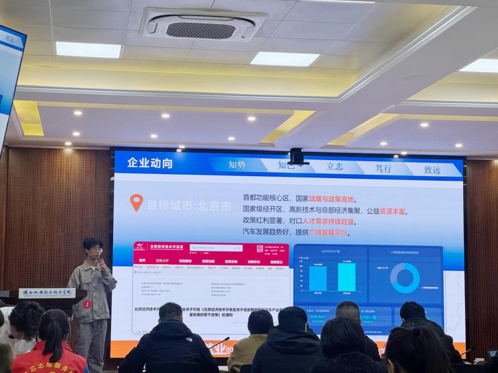 决赛现场,气氛热烈。交通运输学院的参赛选手们精神饱满、自信昂扬,他们紧扣当下汽车行业的发展趋势与人才需求,围绕职业目标锚定、能力素养匹配、成长路径设计、行业前景分析等核心维度,结合自身专业学习经历与实践积累,生动阐述了个人职业生涯规划方案。从对专业领域的深度钻研,到对未来职业发展的清晰预判,再到对自身成长的精准规划,选手们逻辑缜密的路演表达、从容不迫的临场发挥,不仅充分展现了新时代青年学子扎实的专业功底与积极向上的奋进姿态,更赢得了现场评委的一致认可与高度赞誉,给大家留下了深刻印象。